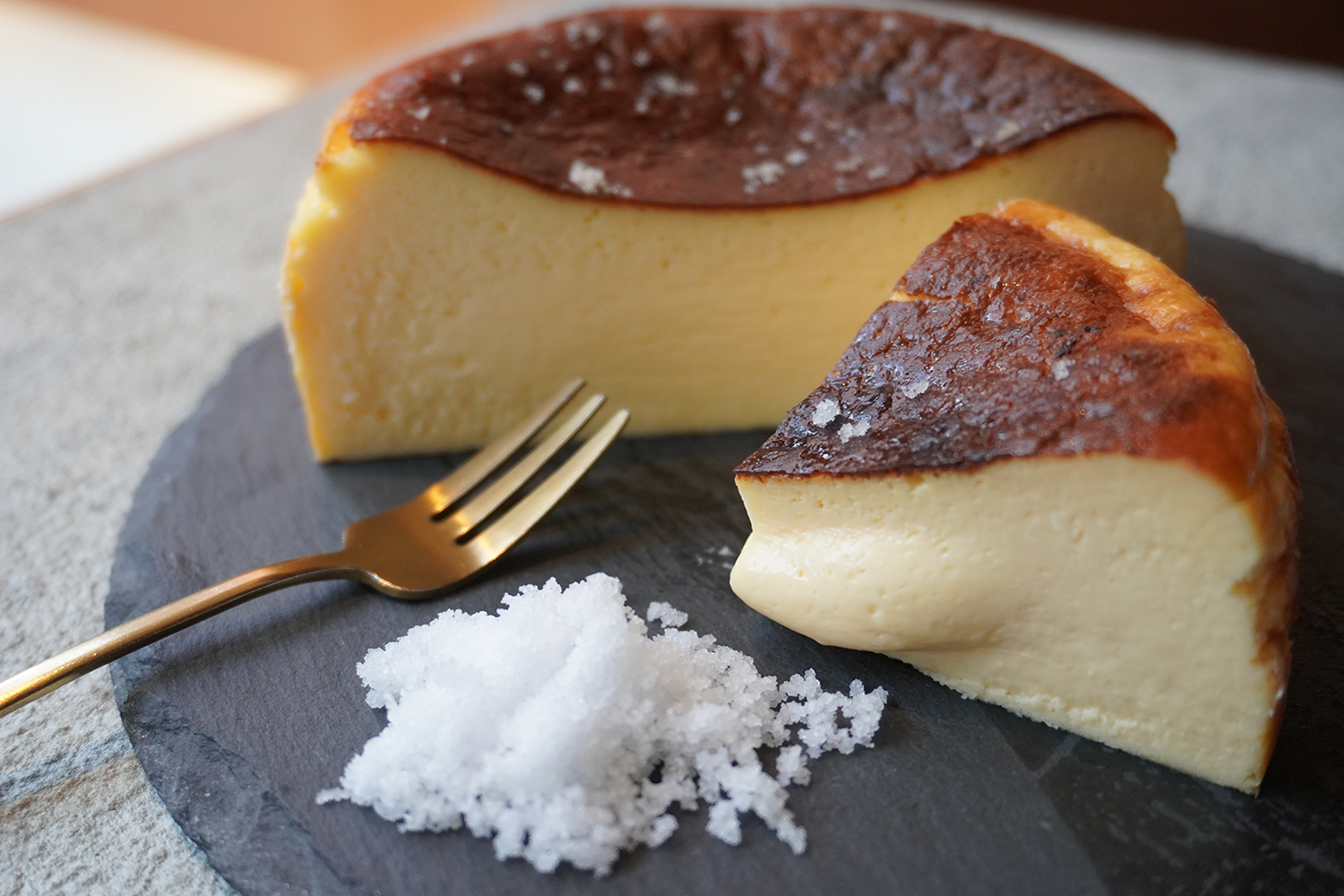 バスクチーズケーキにかかる、かすかな塩味がさらに甘みを引き立てます。